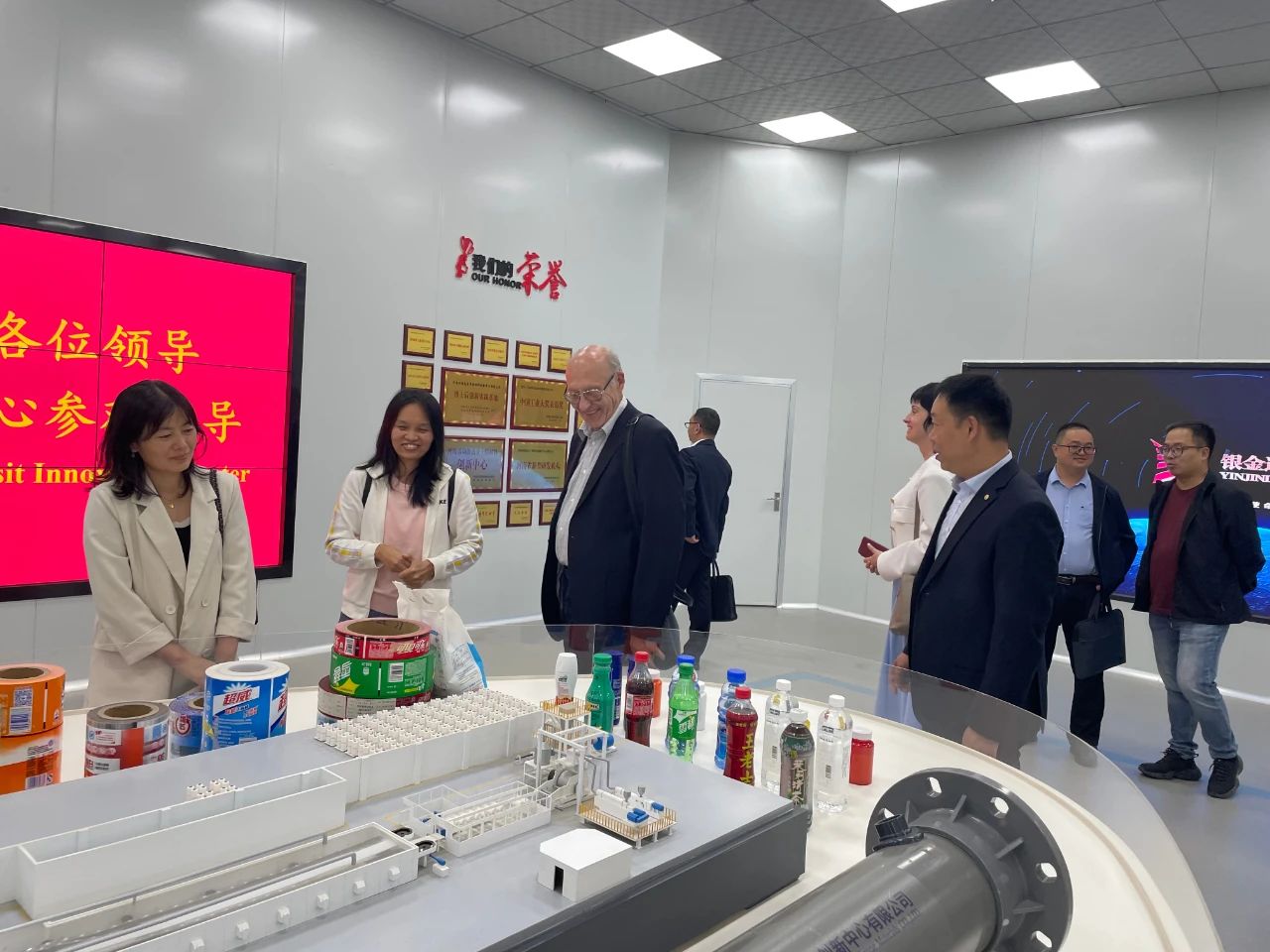 在達新源生產(chǎn)線夏總向彼得科維奇院士介紹了PETG產(chǎn)品的市場推廣應用情況,彼得科維奇院士對銀金達PETG產(chǎn)品取得的市場地位感到由衷贊嘆。